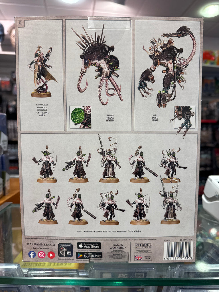 Twisted artistry and nightmarish science converge in Combat Patrol: Coven of Agonies. At its heart stands the sinister Haemonculus Xatrophos Nuul, master fleshcrafter, leading his grotesque creations into battle. This force includes a Cronos and a Talos engines of torment that harvest pain on the battlefield alongside 10 warped Wracks, each a living testament to the Covens cruel experiments. Perfect for beginning a Drukhari army or expanding your collection with the darkest horrors of Commorragh.